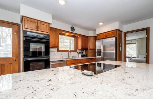 Ranch style house has lots of room for everyone. Fully stocked kitchen with dining table for eight and island seating for four. For those cooler autumn evenings, cozy up to the wood-burning fireplace in the spacious TV room. Kids and adults alike will love the games room with foosball and air hockey! Primary bedroom with king bed an en suite full bath.