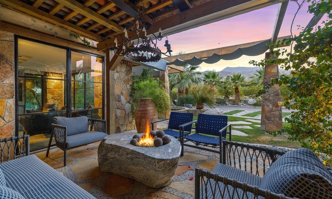 The grounds have the perfect mix of shade and sun, with plenty of space to spend time with your group, or step away for some alone time. The yard is a paradise and features a deep pool with a wide tanning shelf and heated outdoor soaking tub. The main pool area also has a built in BBQ, seating, lounge chairs, and a cozy firepit, just perfect for stargazing at night. Outdoor dining with seating for 8. Follow intimate pathways to more seating on the other side of the house with another firepit and views. The landscaping makes this hideaway feel like a private paradise, mature cactus, ficus, palms, trailing bougainvillea and the incredible mountains, all add to the magic of this very special property.