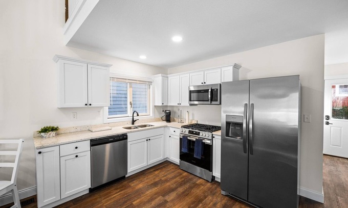 Fully equipped kitchen (utensils, microwave, large fridge, stove/oven, toaster, pots/pans, Keurig coffee maker, glasses, etc.)