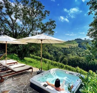Food & DrinkTea/Coffee makerBathroomBody soap, Hairdryer, Shower, Bathtub or shower, Toilet paper, Free toiletries, Towels, Shampoo, Toilet, Private bathroomMedia & TechnologyTV, Flat-screen TVActivitiesHot tubKitchenElectric kettle, Wine glasses, Coffee machine, Kitchenware, Kitchenette, Stovetop, Refrigerator, Dining table, Toaster, DishwasherLiving AreaDining area, Sofa, Sitting area, DeskOutdoorsOutdoor dining area, Outdoor furniture, Terrace, PatioGeneralKey access, Trash cans, Private entrance, Heating, Fire extinguisherViewGarden view, Mountain view, ViewBedroomChildrens' cribs, Linens, Wardrobe or closetAccessibilityUpper floors accessible by stairs onlyBuilding CharacteristicsSemi-detachedRoom AmenitiesSofa bed, Clothes rack, Non-feather pillow, Socket near the bedPool and SpaPool towelsExclusive servicesFree spa access |
