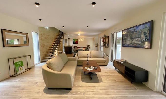 All-inclusive gîte (except tourist tax) with private, heated indoor swimming pool (7x3.5m) (secure access door) and 3/4-seater sauna. [hidden] : living room (2 connected TVs, billiards area) open to the kitchen (3-burner induction hob, wine cellar, Krups grain coffee maker and filter coffee maker), 1 bedroom for disabled people (1 bed 160x200, bathroom with toilet), wellness area accessible via the living room (indoor swimming pool, 3/4-seater sauna, toilet), separate toilet. Floor (reversible air conditioning): 1 bedroom (1 bed 90x200, 2 twin 90x200 beds, shower room with toilet), 1 bedroom (1 bed 160x200), 1 bedroom (3 90x200 beds including 2 twinable), 1 bedroom (2 twin 90cm beds, bathroom with toilet), shower room, toilet. Electric heating (included in prices). WIRELESS. Vast landscaped garden with trees of approximately 2500 m² (gas/plancha barbecue). Charging station for 11 KW electric vehicle (additional depending on meter). Sophrology sessions on request (extra charge). Eco-construction house. Non-smoking accommodation. POOL OPEN: all year round. This exceptional contemporary villa brings together all the ingredients to make your stay unforgettable. Its indoor swimming pool and sauna, its American billiards table, its magnificent bar for moments of pure conviviality and the grandiose equipment are magnified by a decoration and an atmosphere where every detail counts. The pleasure of the eyes as well as the general well-being, whether indoors or in the sumptuous garden bordered by the forest, will guarantee you moments of happiness to share with family or friends. If you like to savor these magical moments provided by this unique place, the riches of the Loire Valley which surround you will seduce you just as much: Saché and its castle, home of Balzac, Azay-le-Rideau, its famous castle and that of Islette, lesser known and no less essential, Villandry and its Renaissance gardens compete in beauty. Chenonceau, Amboise, Chambord or Chaumont-sur-Loire are to be discovered, like the Beauval Zoo...