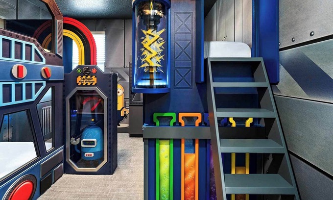 (4 twins) Calling all mini mad scientists! This ‘Imagination Lab’ themed bedroom will have you concocting all kinds of imaginative fun. Custom wall decals feature metallic hatches, rivets, and vents, creating the feel of a secret, underground lab. Adding to the illusion are giant knobs, dials, test tubes, and meters adorning the custom-made bunk beds. An oversized power outlet humorously proclaims "high voltage," with pipes weaving through the design–adding to the industrial aesthetic. Even the swirly, bright yellow light fixture feels like it’s designed to ignite the minds of little ones brewing their imaginary experiments!