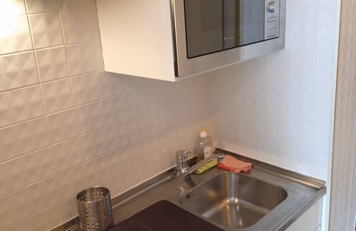 The kitchen is equipped with an oven, a stovetop, and a refrigerator, as well as a coffee maker, a microwave, and cookware. Other amenities include a dining area, housekeeping, heating, and a dining table.