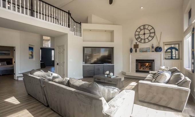 Open concept living room, chef kitchen and wet bar with mini fridge. Fully stocked kitchen with coffee maker, full dishware and glassware and cooking essentials. Play pool, table tennis or board games in the game room with TV. Living area has 86” TV and gas fireplace.