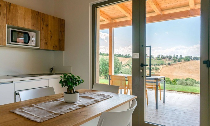 The vacation apartment comes equipped with essential amenities for a comfortable stay. The kitchenette, located in the entrance area, includes a dishwasher, two induction hot plates, a microwave, and a dining table. The bathroom is furnished with a shower, bidet, and toilet. Air conditioning and forced-air heating are available throughout the unit for your comfort, although there is no separate heating option. The patio, spanning 20 square meters, is furnished with terrace furniture and offers a beautiful panoramic view of the countryside. Additional facilities include a hair dryer and free WiFi internet access. Reserved parking is available at the house.